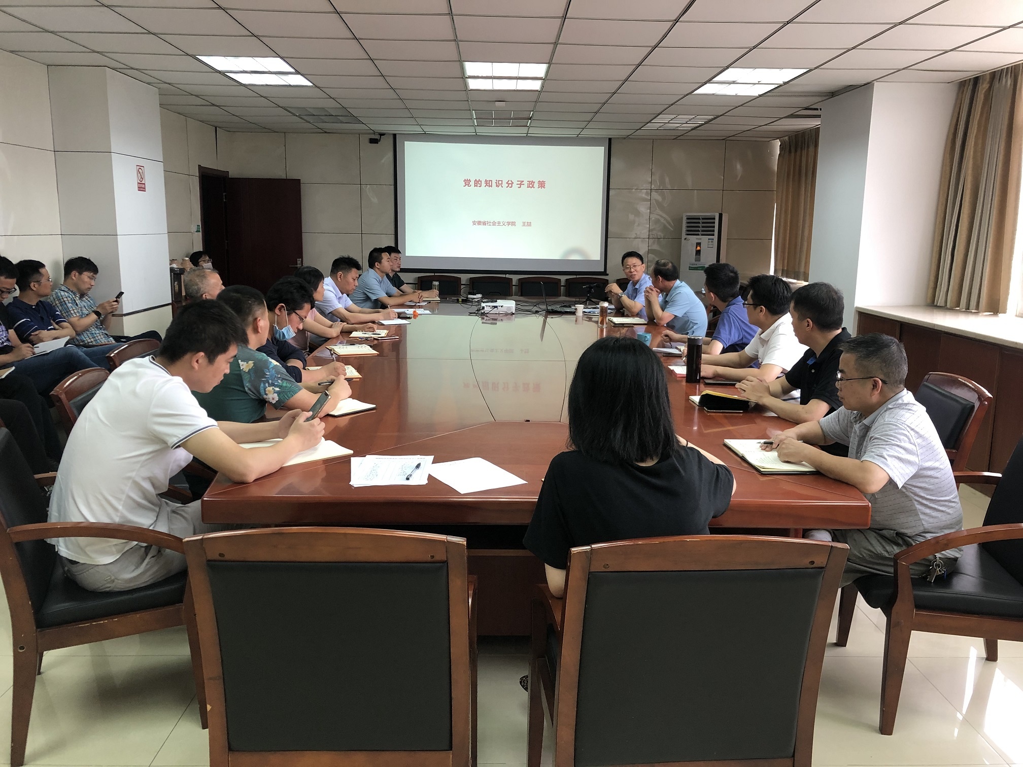 韩锋副院长首先向王喆副教授及周元宝部长一行的到来表示欢迎,并详细介绍了我院职工年龄结构、学历、政治面貌等构成情况,同时对我院当前科研平台的建设情况及取得的成绩等进行了简要说明。周部长对我院举行该次讲座表示赞赏,指出在我院这样的高学历知识分子的聚集地宣讲新时代党的知识分子政策十分必要。