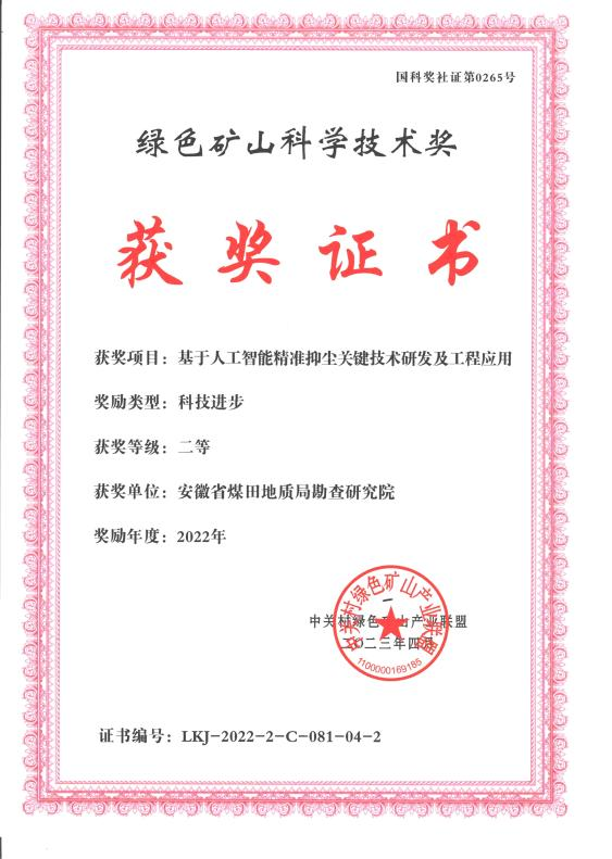 近日收悉,“基于人工智能精准抑尘关键技术研发及工程应用”科技成果荣获2022年绿色矿山科学技术进步奖 二等奖。该奖项是合肥合安智为科技有限公司、安徽省绿色矿山工程研究中心、安徽省煤田地质局勘查研究院、安徽理工大学“产学研”合作的硕果。