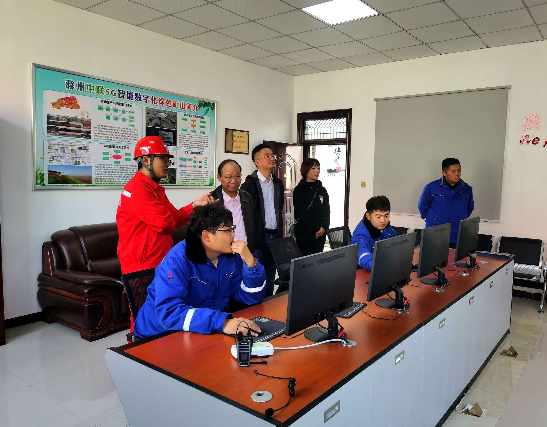 调研所在地滁州市腰铺镇二郎黄槽坊水泥用灰岩矿建有滁州中联水泥有限公司与我局安徽省绿色矿山工程研究中心联合打造的我省首个5G绿色矿山示范工程项目,该项目基于5G通信技术,帮助矿山实现了人员与设备优化管理、矿区安全生产、资源高效开发、成本控制与节能降耗等方面的全面提升,在业界享有声誉。